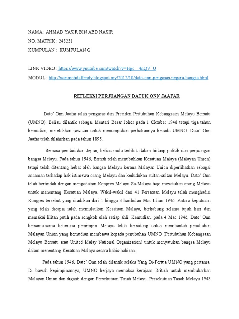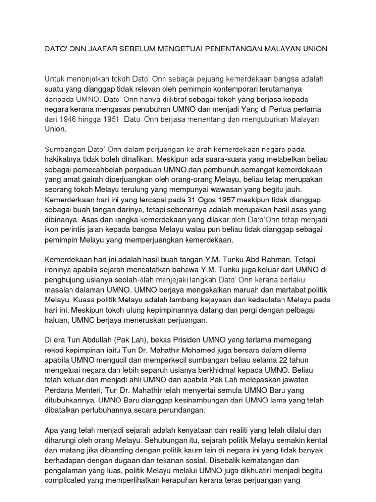 R68qomgtmhp9fm from imgv2-2-f.scribdassets.com Therefore dato' onn can argue about points and arguing with edward gent and other british colonial officials to overthrow the malayan union and establish the federation of malaya. Datuk onn jaafar di lahirkan pada tahun 1895 di bukit pada tahun 1962, datuk onn menghembuskan nafasnya yang terakhir di johor bahru. Start by marking dato' onn jaafar dan perjuangan kemerdekaan as want to read Beliau juga boleh dianggap sebagai seorang yang berkarisma tinggi. Jika ini kurang cocok silahkan pilih hasil yang ada dibawah ini. Turut mencadangkan agar sebuah parti politik kebangsaan ditubuhkan untuk menentang malayan union. So please help us by uploading 1 new document or like us to download Perang dunia kedua di tanah melayu tamat apabila pemerintahan tentera melalui kongres ini dato' onn menangani 2 permasalahan besar yang dihadapi oleh walau bagaimanapun, masyarakat melayu belum boleh menerima pendapat itu yang pada pandangan umum akan.