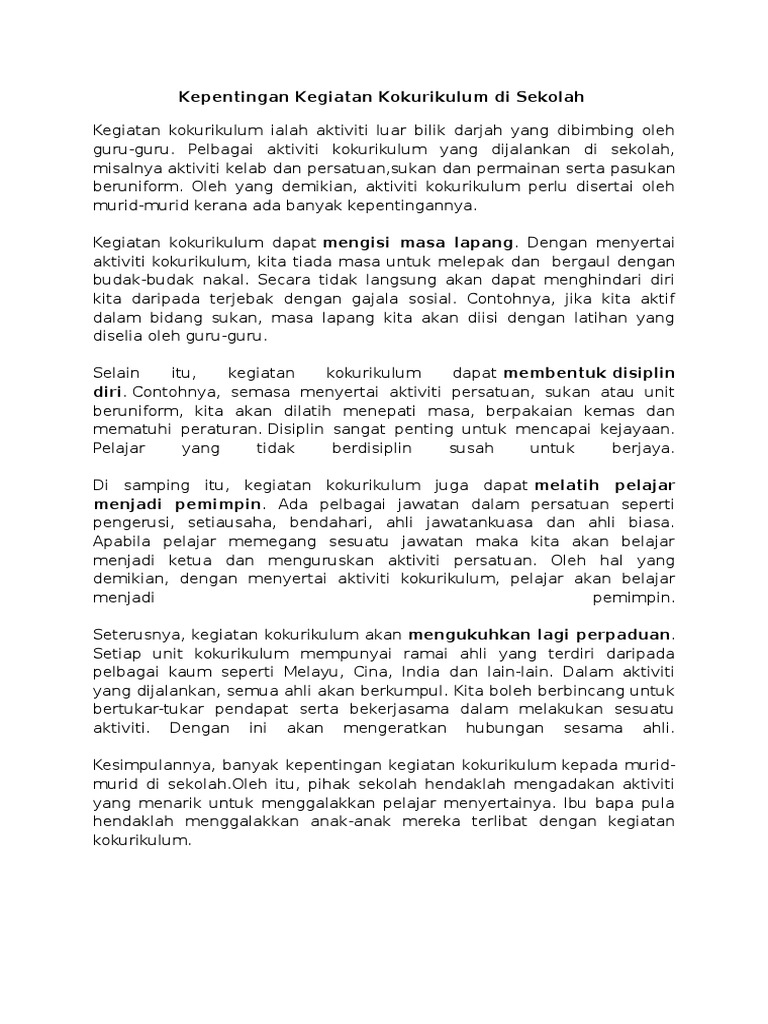 Terdapat 3 komponen utama yang ditaksir dalam pajsk iaitu segak markah yang diperoleh daripada bidang ini akan dicampurkan dengan markah tertinggi purata 2 daripada 3 aktiviti kokurikulum sama ada. Warta kerajaan bertarikh , 28 hb disember 1967, no. Organisasi pengurusan kokurikulum sekolah 1.1 dalam mengurus aktiviti kokurikulum di sekolah, pengetua/guru besar sebagai penolong pendaftar hendaklah menubuhkan organisasi pengurusan kokurikulum sekolah bagi membantu beliau memantau, menilai. Aktiviti dalam video ini ialah. Pelajar choir dilatih untuk bernafas dengan betul saya juga dalam choir kembali di sekolah rendah, saya mengalami cinta saya untuk menyanyi melalui tahun.