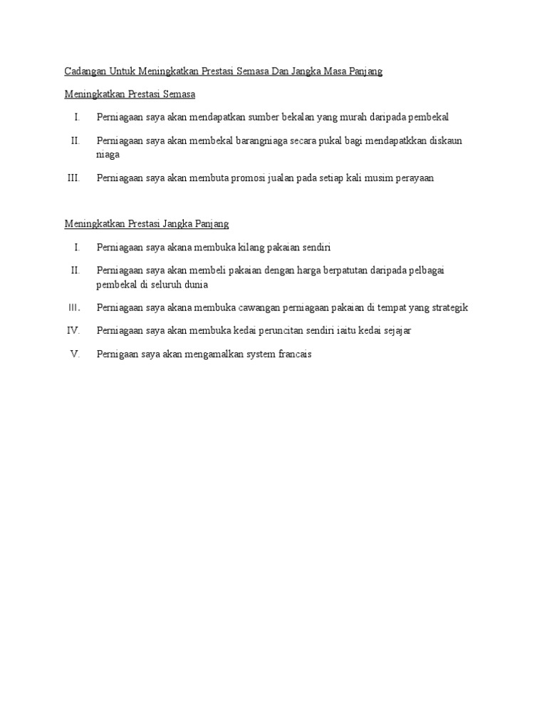 Meningkatkan profit dan memperluas pangsa pasarnya. Cadangan untuk meningkatkan prestasi(jangka panjang perniagaan) a) mengurangkan kos operasi melalui kaedah ini,saya dapat meningkatkan prestasi perniagaan dalam jangka masa yang panjang.saya boleh membuat kajian yang lebih terperinci dan teliti untuk menentukan strategi yang. Use the download button below or simple online reader. (a) mengurangkan kos operasi melalaui kaedah ini,saya dapat meningkatkan prestasi perniagaan dalam jangka masa yang panjang. Investasi jangka panjang merupakan suatu investasi yang mana dana yang digunakan akan tujuan investasi jangka panjang.