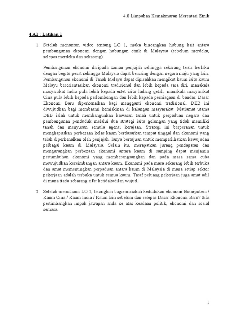 Dasar Ekonomi Baru from imgv2-2-f.scribdassets.com Pembangunan ekonomi dalam konteks hubungan etnik di malaysia. Hubungan etnik (lmcw2173) me or muhamad azril bin hamzah ( a168695) bab 3: Agihan kekayaan negaradi malaysia, adalah amat penting untuk mengagih kekayaan negara secara adil dan saksma.ini adalah kerana kekayaan tidak seharusnya dikuasai oleh satu etnik sahaja, manakala etnik yang lain tercicir.kesan daripada kegagalan dalam agihan kekayaan yang adil boleh. Mengenai ekono mi penduduk di t anah mela yu selepas menc a pai k emerd ekaan. Ringkasan bab hubungan etnik (bab 3 dan 8) course: Kesan dasar ekonomi baru terhadap hubungan etnik di malaysia. Hubungan etnik bab 4 pembangunan ekonomi. Ia lansung menafikan dakwaan segelintir masyarakat cina dan india yang mengatakannya tidak adil.19 kua kia soong (1987) juga menjelaskan punca konflik hubungan etnik adalah.